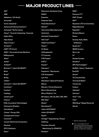 HARDWARE&FASTENERSMAJOR PRODUCT LINESNewly AuthorizedFor a complete list of manufacturers and brands, please refer to the product groups inside the catalog.3M™ABBAbbatron / HH SmithAccuride®Acme IndustrialAdvanced Interconnections®Aeroquip® PerformanceAlcoa® / Arconic Fastening / HowmetAlpha WireAlps AlpineAltech Corp.®Amatom®AMP® (TE Conn)ASM® / Accurate Screw Machine*ASRaymondAtlas®Avdel®Avibank®Birtcher®/ nVent SCHROFF®BivarBoyd®BradyCalfax®Calmark®/ nVent SCHROFF®Cambion®Camloc®CaplugsCatamount®Cherry®*CML Innovative TechnologiesChomerics (Parker)Click Bond®Colson® Group USAComponents Corp.®Concord®Corsair Electrical ConnectorsDeutschDFCI SolutionsDzus®Electronic Hardware Corp.ESNA®EssentraFastener TechFluke Electronics®Glenair®Hammond Manufacturing®HantronixHartwell Corporation®Heli-Coil®HellermannTyton®Heyco®Hi-ShearHollingsworthITT CannonITW Fastex®KATO®Kaynar®Keensert®Keystone® ElectronicsLISI AerospaceLyn-tronMarathon® Special ProductsMarcoMersen / Ferraz ShawmutMicro DimensionalMicro Plastics,® IncMil-Specs, AN, AS, BAC, MS, NASMill-Max®Molex®Monadnock™nVent HOFFMAN®nVent SCHROFF®Nylok®Omega™ Engineering / DwyerOptifusePrecision Aircraft Machining Co (PAMCO)Panduit®PEM®Pomona ITT®POP® RivetsRAF™Raychem (TE Connectivity)Regal RexnordRepublic®Richard MannoRosanScrews, Nuts, Bolts & WashersSeastrom®SEMS ScrewsShur-LokSI®Socket ScrewsSouthco®SPS Technologies®Staffall / Useco / Sealectro*SunLEDSunon®TE ConnectivityThomas & Betts®TinnermanUmpcoUnbrako®Unicorp®VCC™ LiteVlier®WM Berg® (Regal Rexnord)Zierick
