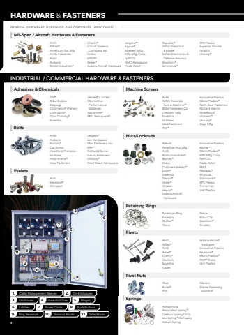 HARDWARE&FASTENERS›Atlas›Avdel®›AVKRivet Nuts›Marson›Sherex Fastening Solutions›AVK›Keystone®›StimpsonEyelets11.Cable Management Sleeves2.Din Enclosures3.Enclosures4.Fuse Switches5.Hinges6.Latches7.Power Cords8.Push Buttons9.Ring Terminals10.Terminal Blocks11.Wire Blocks›3M®›B & J Rubber›Caplugs›Chomerics® (Parker)›Click Bond®›Dow Corning®›Essentra›Henkel® (Loctite)›Momentive Performance Materials›Socomore®›PPG Aerospace®Adhesives & Chemicals›Abbott›American Nut Mfg.›Ankit›Bristol Industries®›Burndy®›Coloc›Continental-Aero™›ESNA®›Essentra›Gesipa®›Greer®›Gripco›Heyco®›Indiana Aircraft HardwareNuts/Locknuts›Innovative Plastics›Kaynar®›Micro Plastics®›MRL Mfg. Corp.›NAFCO›Paolo Astori›PEM›Republic®›Shur-Lok›Simmonds®›SPS Flexloc›Tinnerman›Volt Plastics›AHG›Allfast®›American Nut Mfg.›Anillo Industries›Ankit›Avibank›Bristol Industries®Mil-Spec / Aircraft Hardware & Fastenersg e n e r a las s e m b l e yh a r d wa r ea n dfast e n e r s (c o n t i n u e d)›Ankit›Avibank›Burndy®›Cal Screw›Heartland Precision›Hi-Shear›Holo-Krome®›Ideal FastenersBolts›Jergens™›Lee Aerospace›Mac Fasteners, Inc.›RAF™›Richard Manno›Saturn Fasteners›Unicorp®›West Coast Aerospace›Ankit›ASM / Accurate Screw Machine™›BGM Fasteners Co›Crescent Mfg.›Essentra›Hi-Shear›Ideal Fasteners›ITW®Machine Screws›Innovative Plastics›Micro Plastics®›North East Fasteners›Richard Manno›Shakeproof›Unbrako™›Unicorp®›Zago Mfg.›American Ring›Essentra›Oetiker®›ParcoRetaining Rings›Precix›Rotor Clip›Seastrom®›Smalley›AHG›Allfast®›Ankit›Avdel®›Cherry®›Deutsch›Essentra›FastexRivets›Indiana Aircraft Hardware›Innovative Plastics›Keystone®›Micro Plastics®›POP® Rivets›Volt Plastics›ASRaymond›Associated Spring™›Century Spring Corp.›Lee Spring® Company›Vulcan SpringSprings›Cherry®›Circuit Systems Company, Inc.›Coloc›ESNA®›Greer®›Indiana Aircraft Hardware›Jergens™›Kaynar®›Moeller® Mfg.›MRL Mfg. Corp.›NAFCO›NMC Aerospace›Paolo Astori›Republic®›Safran Electrical & Power›Safran Electronics & Defense Avionics›Seastrom®›Simmonds®›SPS Flexloc›Superior Washer›Umpco›Unicorp®4INDUSTRIAL / COMMERCIAL HARDWARE & FASTENERS1234568911107